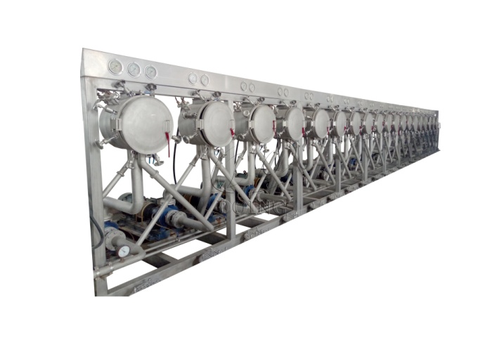 4、提純。由于篩分后得到的淀粉漿里還有一些纖維、果膠、蛋白、脂肪等雜質,這些雜質會影響淀粉的純度、白度、灰分、蛋白含量等等,所以需要將土豆淀粉漿進一步提純,配備旋流器進行土豆淀粉漿提純。
